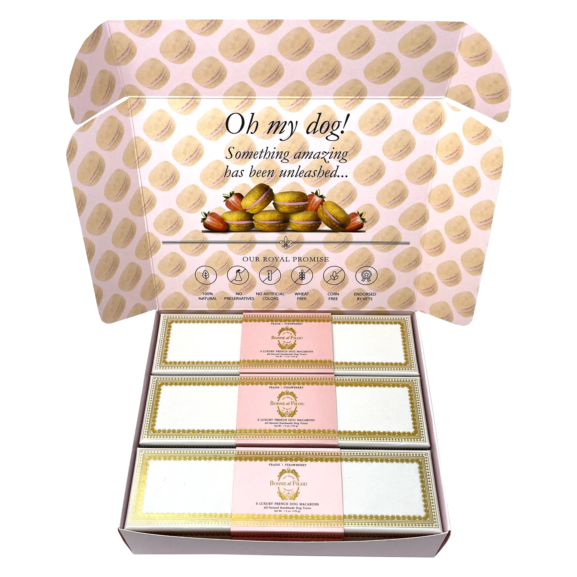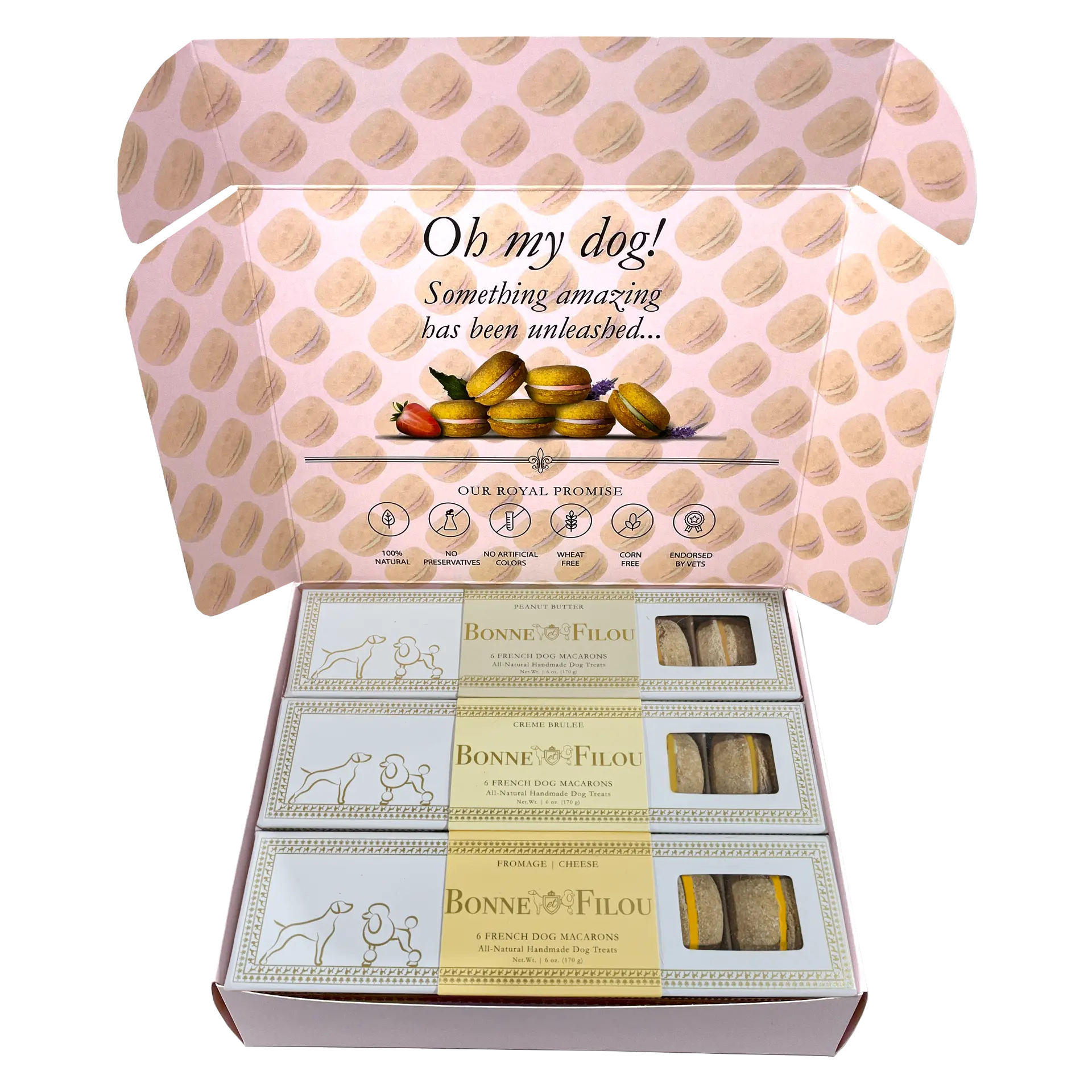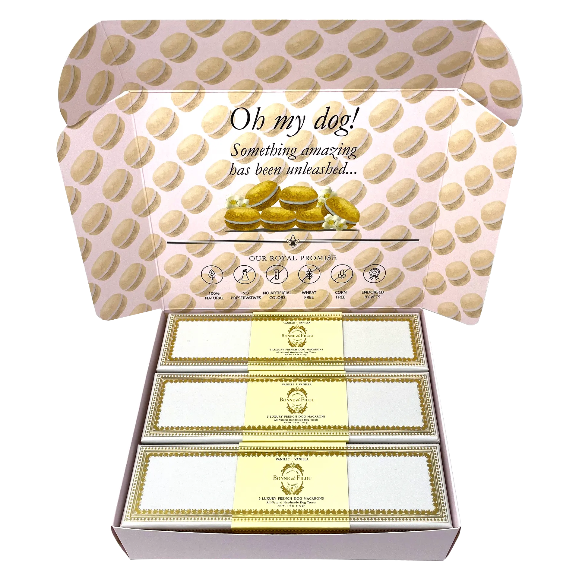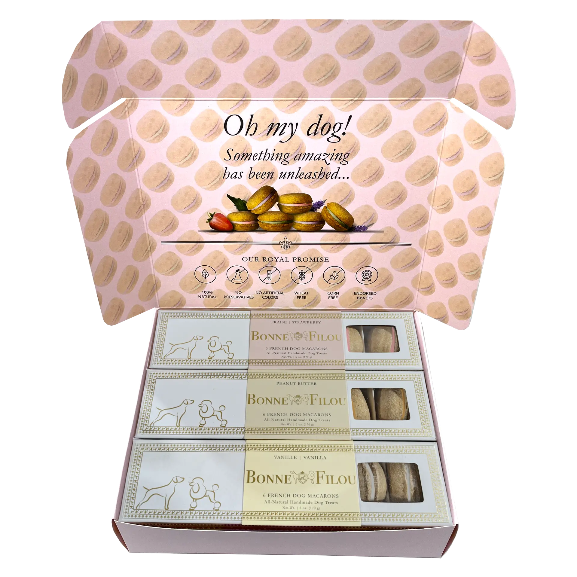 - 3 Boxes of 6 macarons (for a total of 18 delectable dog macarons)