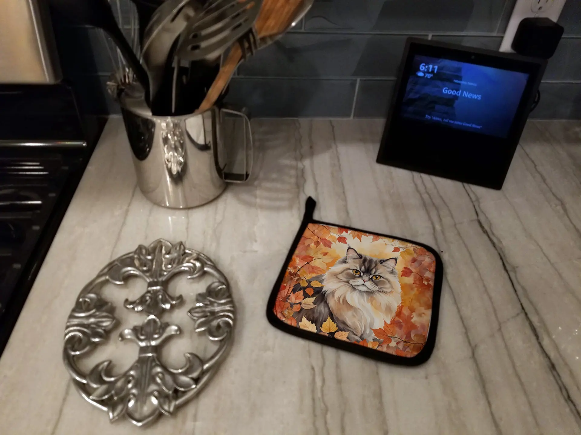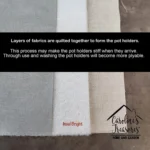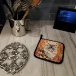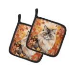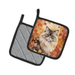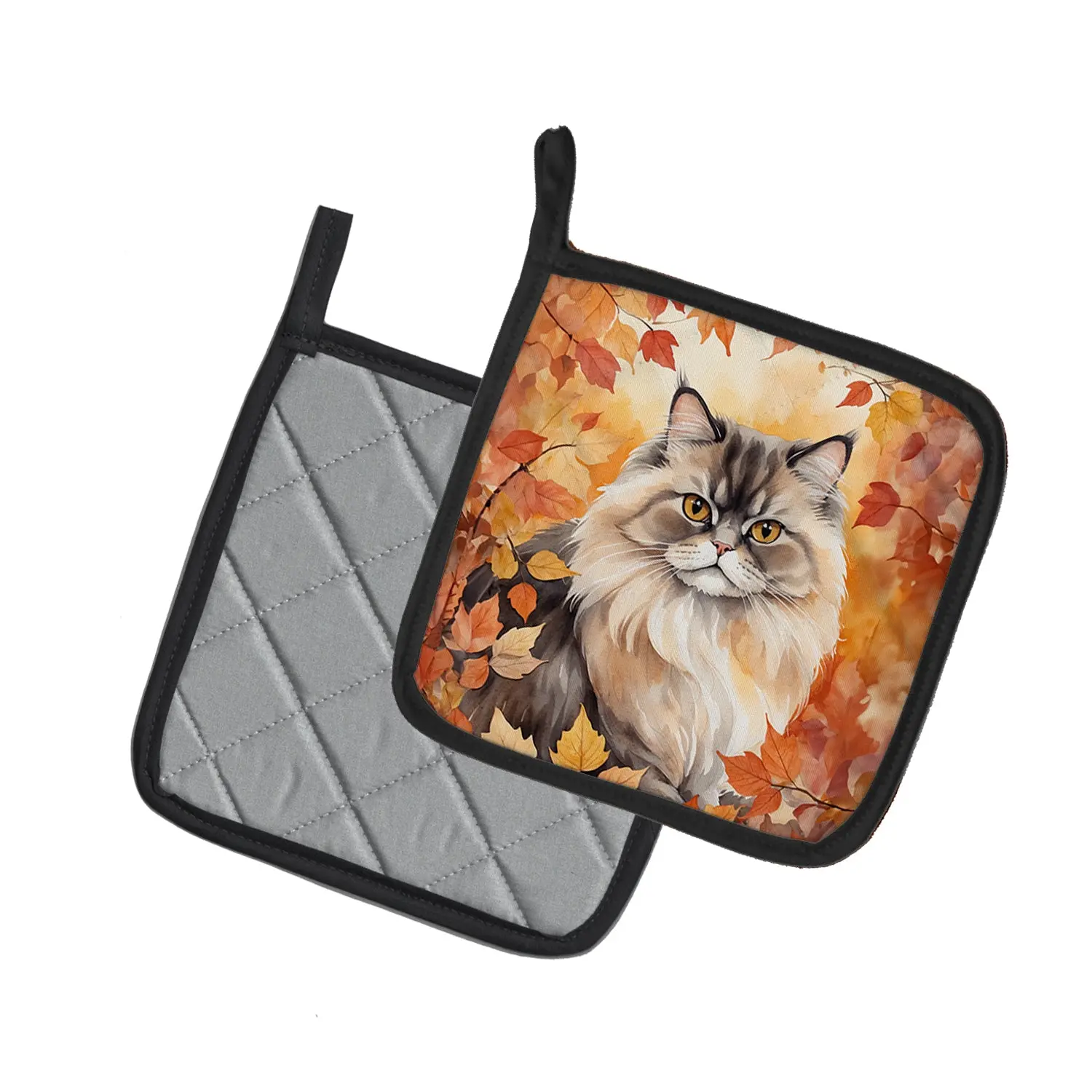 Pair of Pot Holders featuring breed specific Persian artwork. A Pair of Pot Holders to match your kitchen decor. Made in the USA these are thick and functional. Full color artwork decorates the front polyester fabric of the hot pad and accented by a black trim. Use these at as a trivet for your Thanksgiving or Christmas tablescape. Filled with insulated fabric and quilted for durability. These colorful pot holders will make a great gift for your favorite home cook or executive chef. Each pot holder measures approximately 7 1/2 inches by 7 1/2 inches. A hanging tab is included.